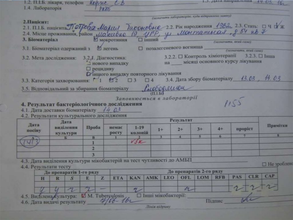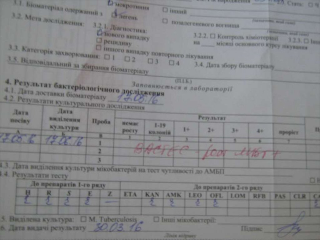 выросло 15 колоний МБТ, чувствительность к препаратам 1
