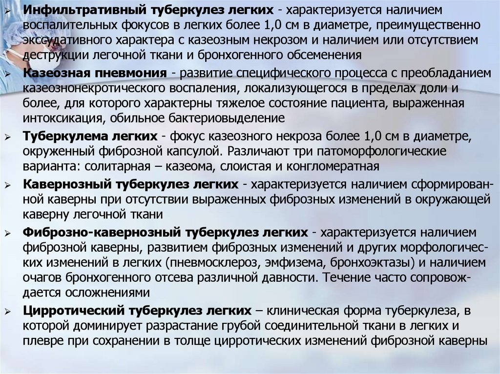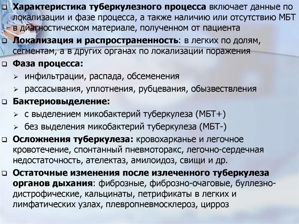 Характеристика туберкулезного процесса включает данные полокализации и фазе процесса, а также наличию или отсутствию МБТ