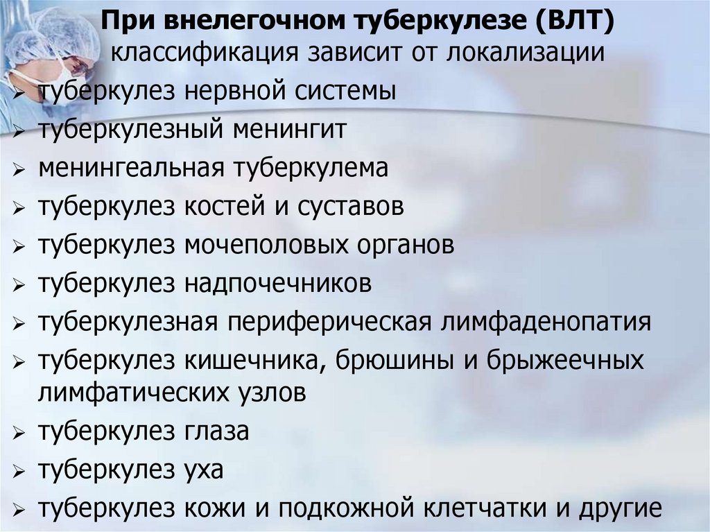 При внелегочном туберкулезе (ВЛТ)классификация зависит от локализации