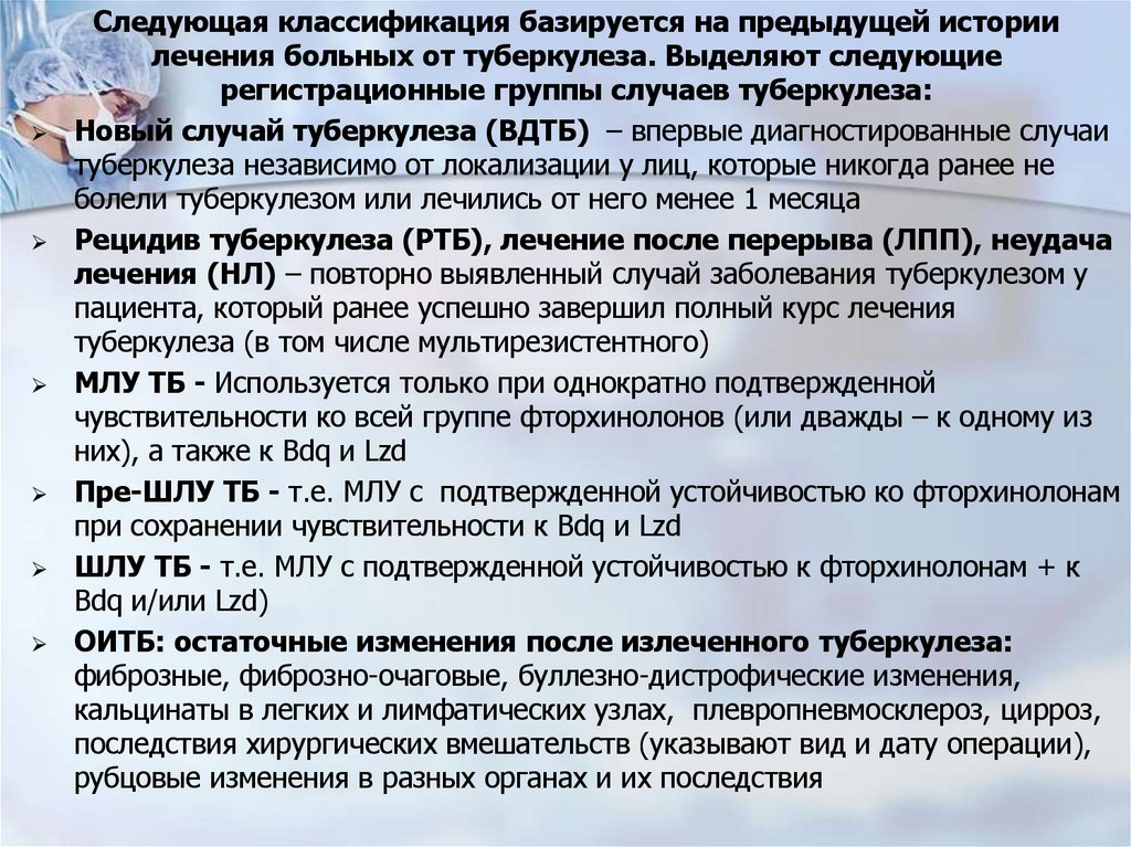 Следующая классификация базируется на предыдущей историилечения больных от туберкулеза. Выделяют следующие