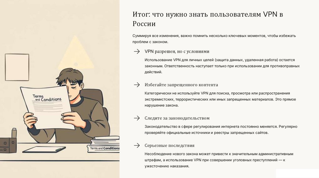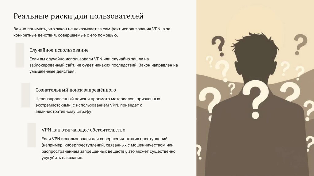 Реальные риски для пользователейВажно понимать, что закон не наказывает за сам факт использования VPN, а за