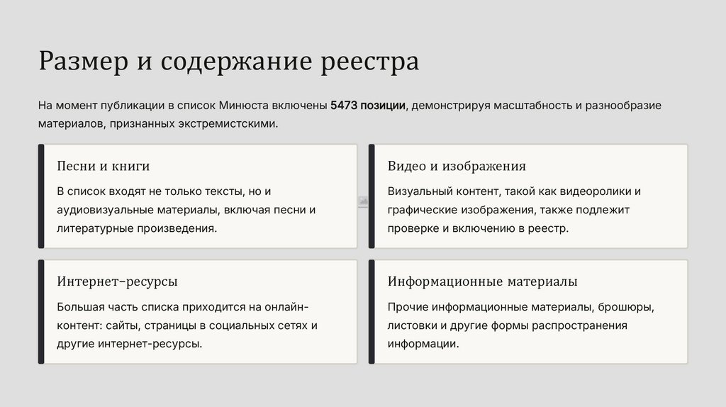 Размер и содержание реестраНа момент публикации в список Минюста включены 5473 позиции, демонстрируя масштабность и разнообразие