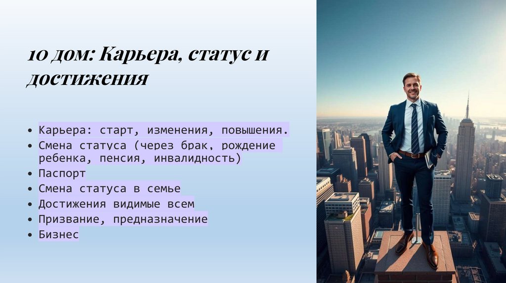 1) Упр. 7/элемент7/Венера, Дсц соединение, трин, квадрат к упр. 10, элементу 10, Сатурну-формула 7+10= получение статуса через партнера, брак