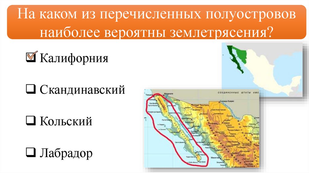 На каком из перечисленных полуострововнаиболее вероятны землетрясения?