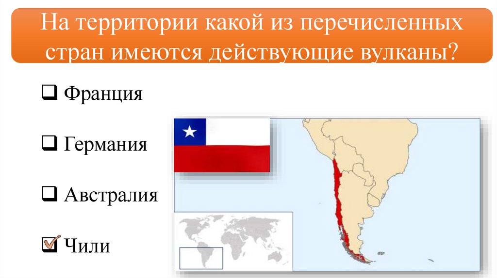 На территории какой из перечисленныхстран имеются действующие вулканы?