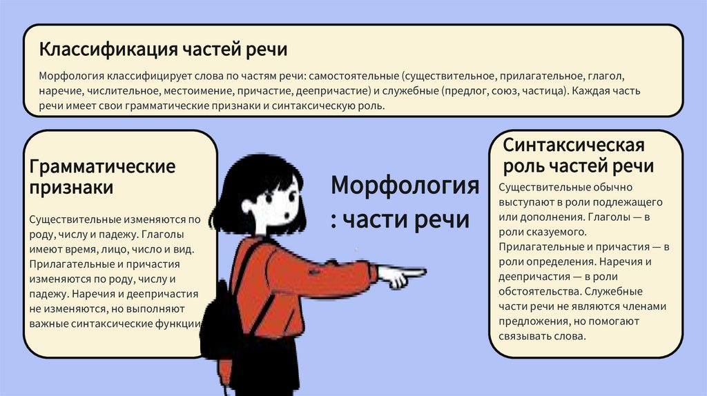 Классификация частей речиМорфология классифицирует слова по частям речи: самостоятельные (существительное, прилагательное, глагол,