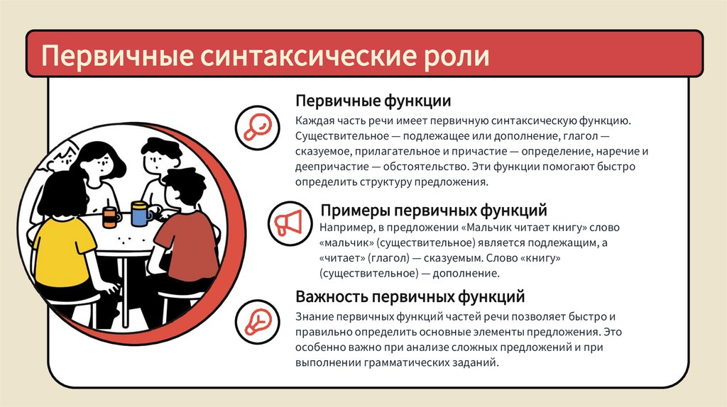 Каждая часть речи имеет первичную синтаксическую функцию.