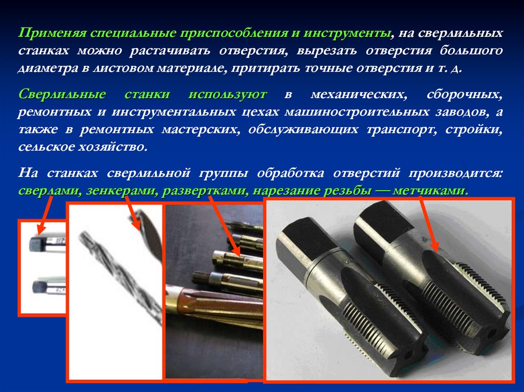 сверлами, зенкерами, развертками, нарезание резьбы — метчиками.