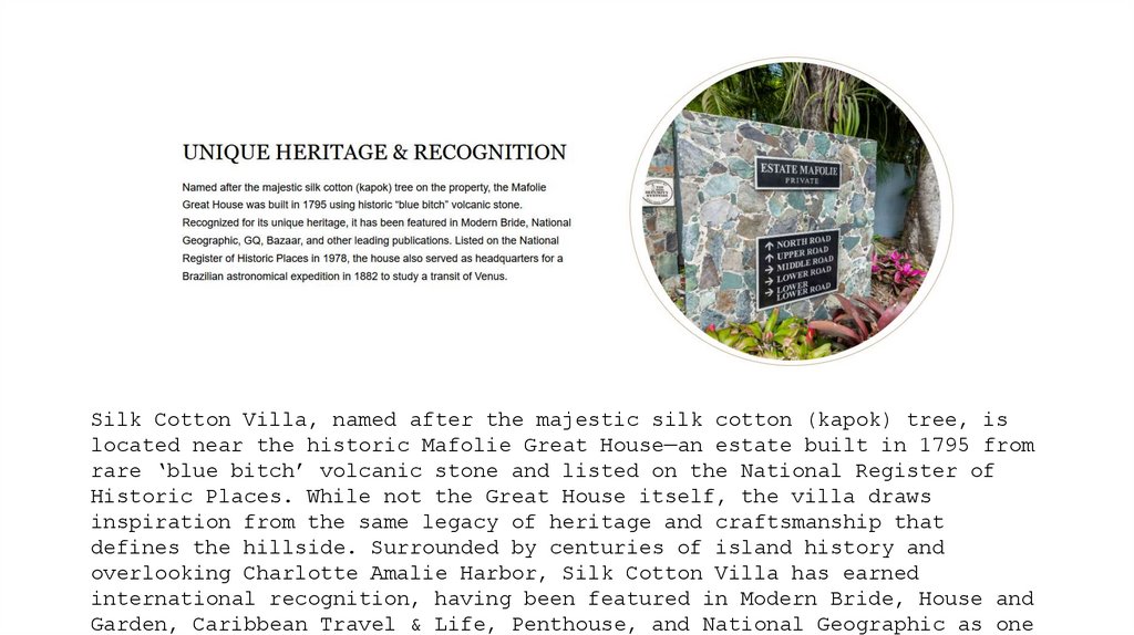 Silk Cotton Villa, named after the majestic silk cotton (kapok) tree, islocated near the historic Mafolie Great House—an estate built in 1795 from