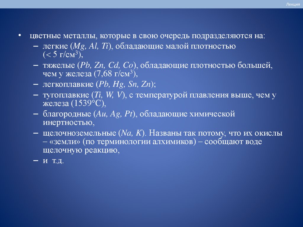 Лекция• цветные металлы, которые в свою очередь подразделяются на: