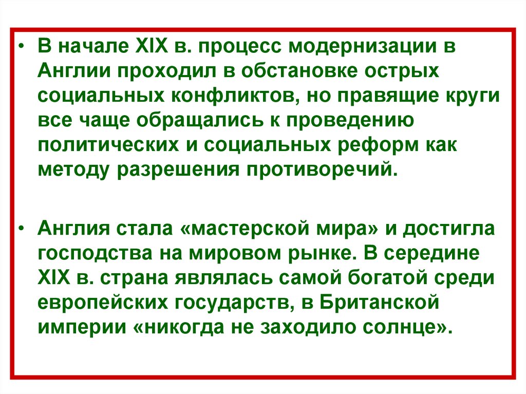 • В начале XIX в. процесс модернизации вАнглии проходил в обстановке острых
