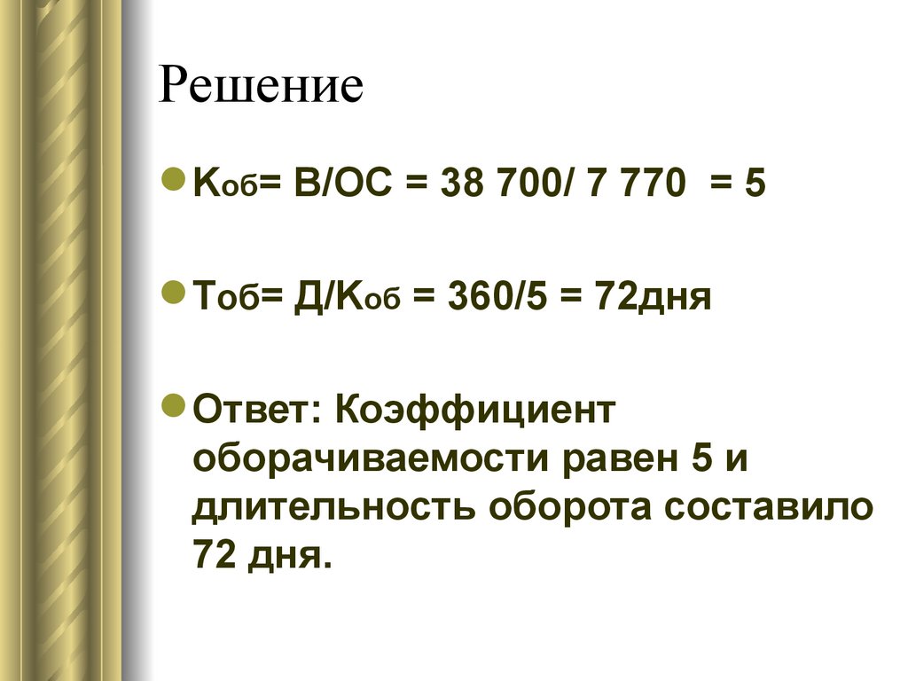 РешениеKоб= В/ОС = 38 700/ 7 770 = 5