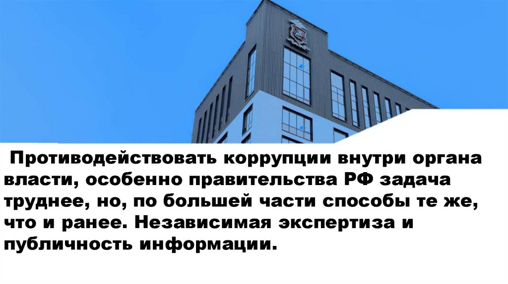 Противодействовать коррупции внутри органавласти, особенно правительства РФ задача