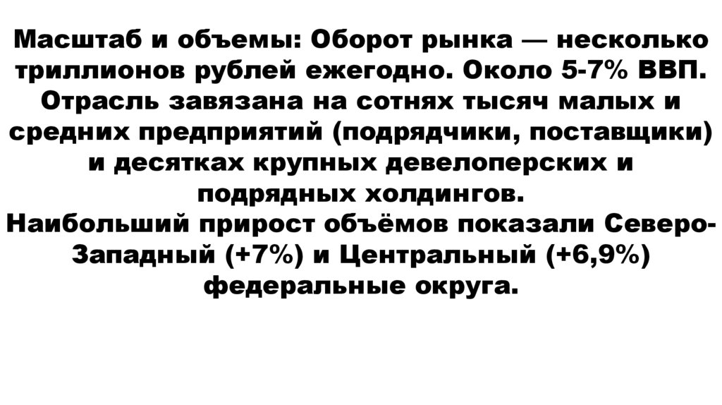 Масштаб и объемы: Оборот рынка — несколькотриллионов рублей ежегодно. Около 5-7% ВВП.