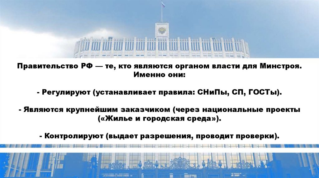 - Регулируют (устанавливает правила: СНиПы, СП, ГОСТы).