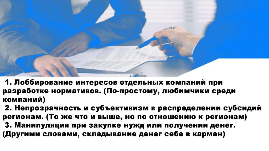 1. Лоббирование интересов отдельных компаний приразработке нормативов. (По-простому, любимчики среди
