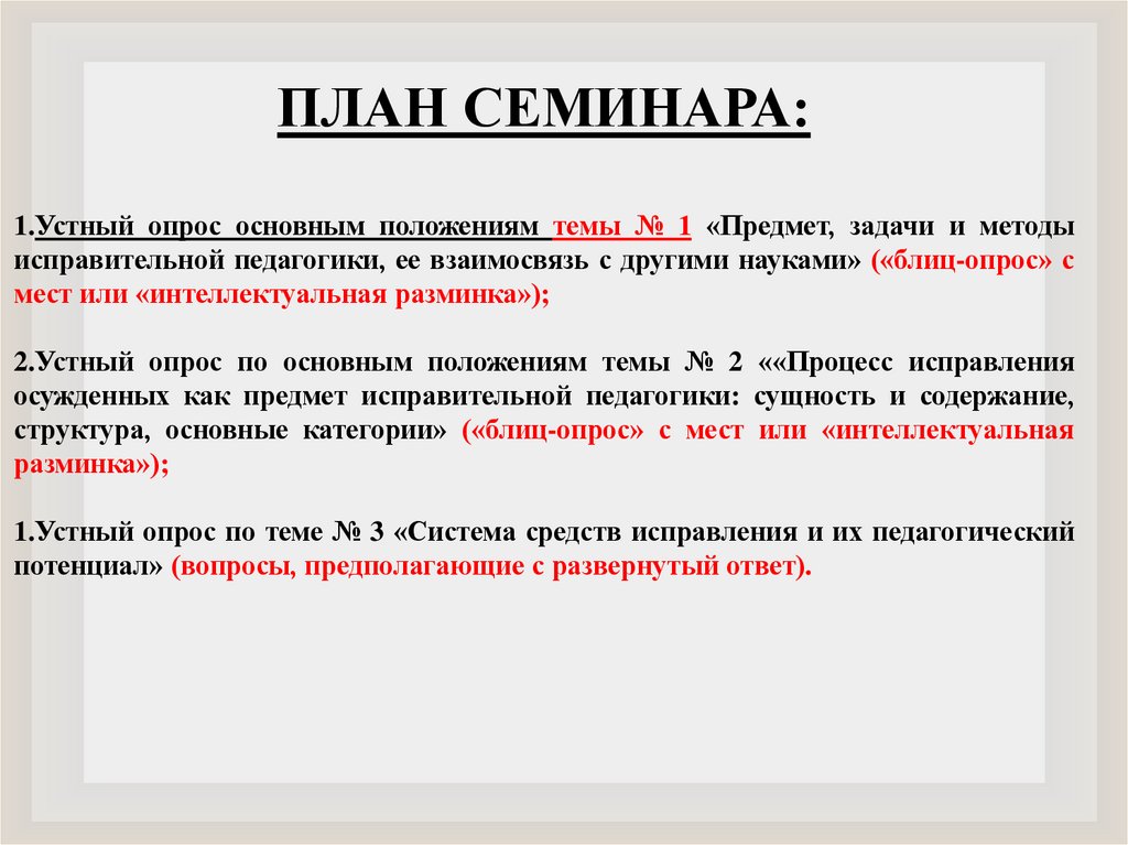 1.Устный опрос по теме № 3 «Система средств исправления и их педагогический
