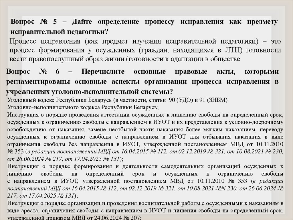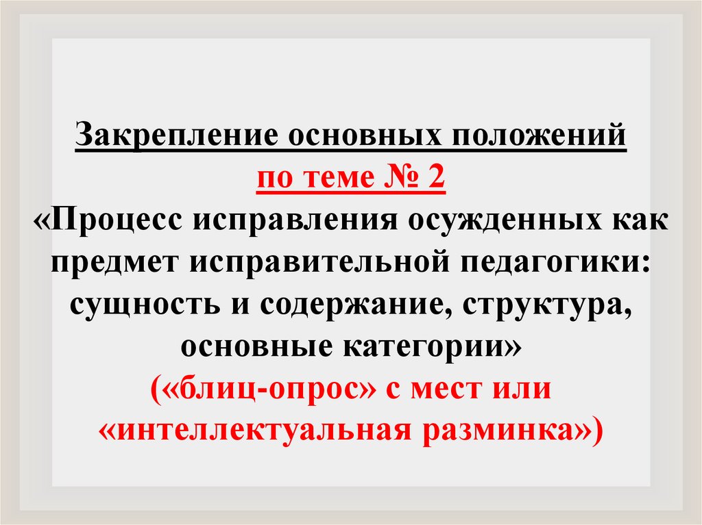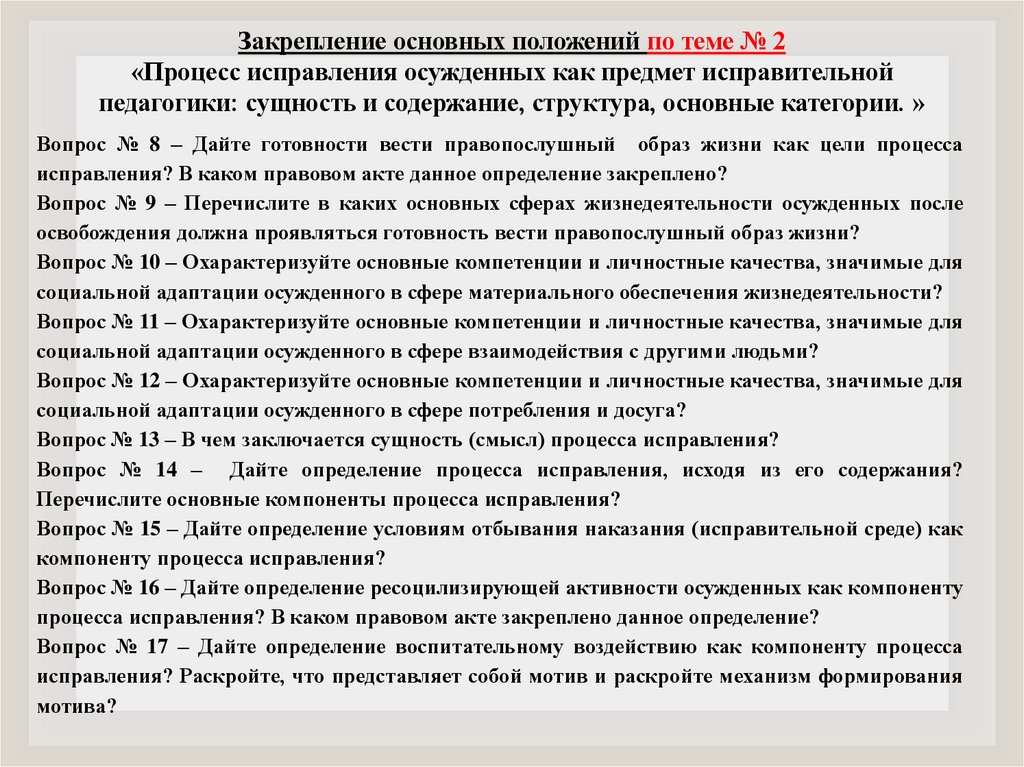 Закрепление основных положений по теме № 2«Процесс исправления осужденных как предмет исправительной