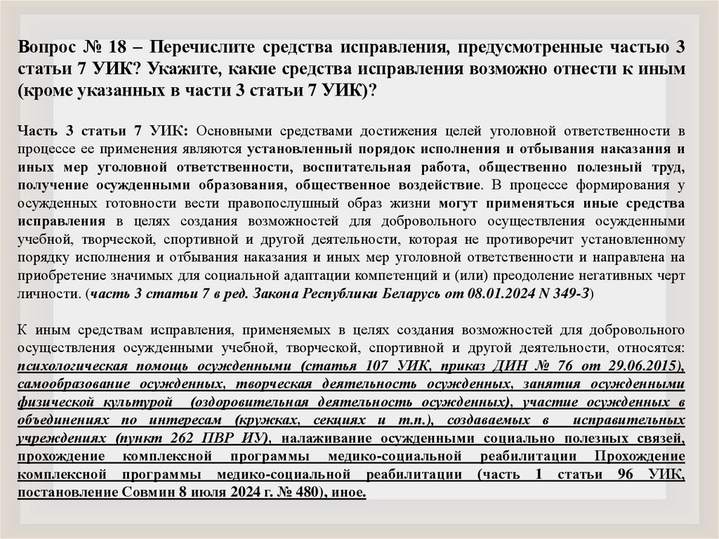 Вопрос № 18 – Перечислите средства исправления, предусмотренные частью 3 статьи 7 УИК! Укажите,