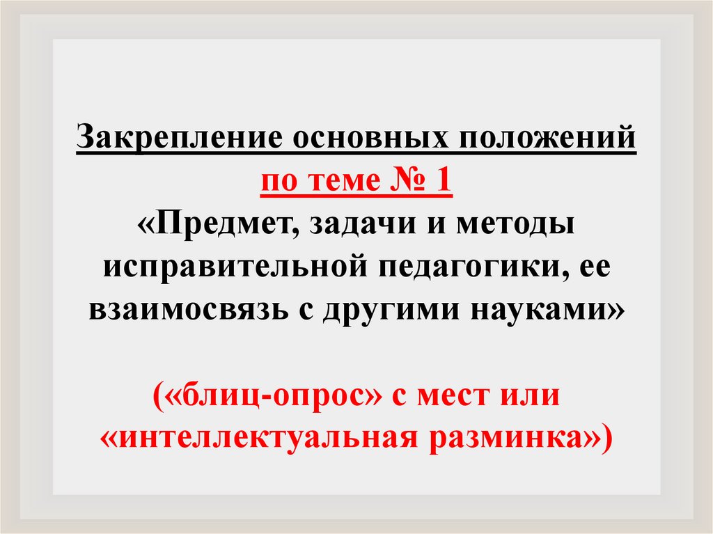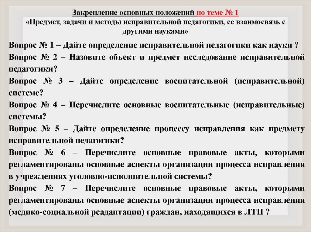 Закрепление основных положений по теме № 1«Предмет, задачи и методы исправительной педагогики, ее взаимосвязь с