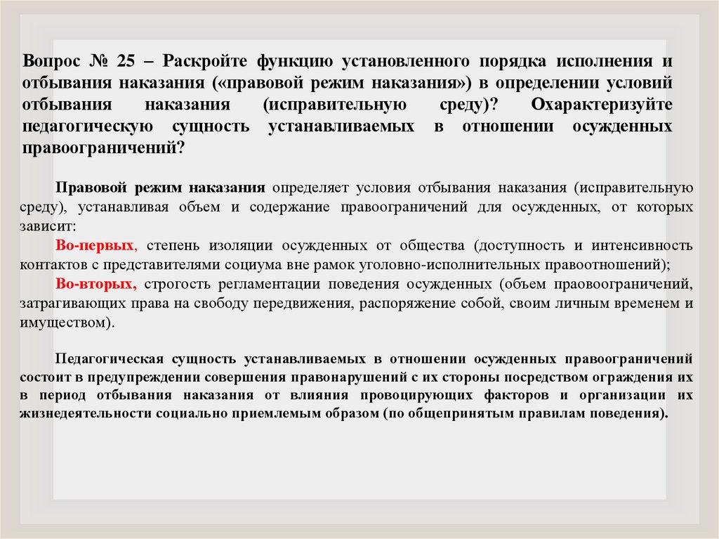 Вопрос № 25 – Раскройте функцию установленного порядка исполнения и отбывания наказания