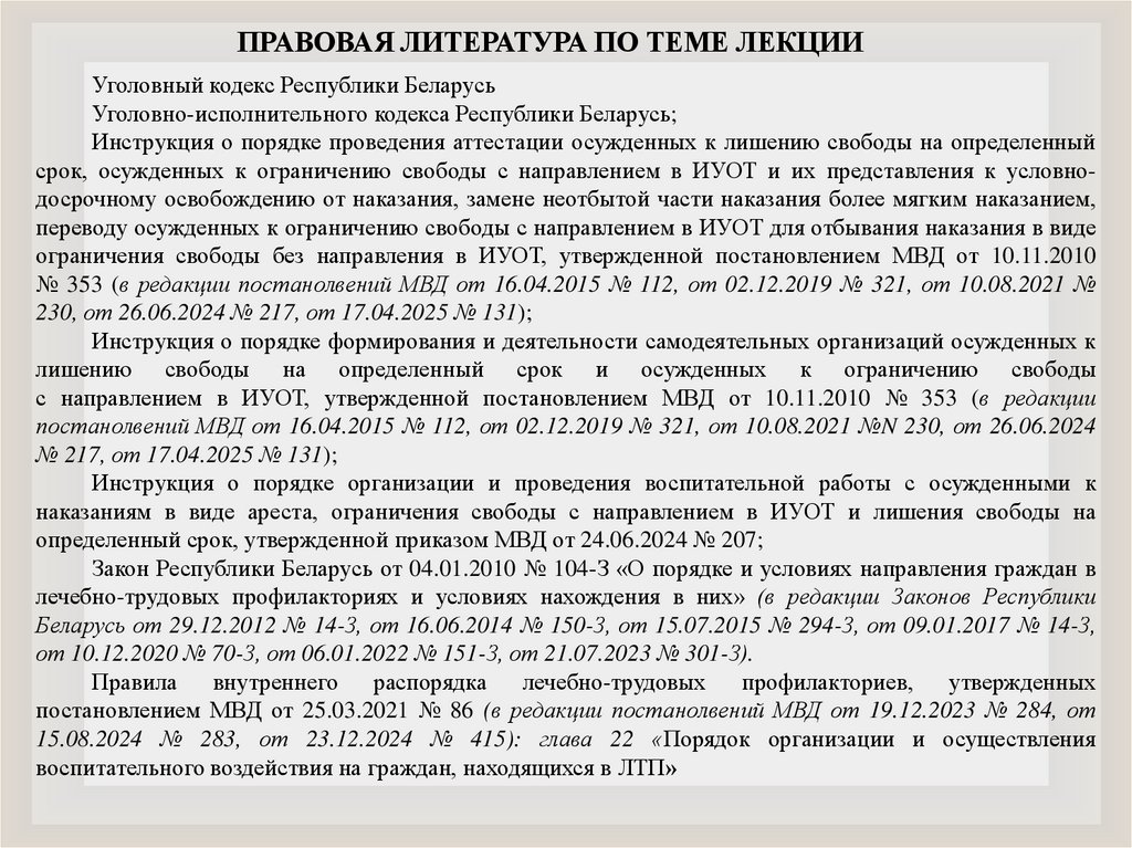 ПРАВОВАЯ ЛИТЕРАТУРА ПО ТЕМЕ ЛЕКЦИИУголовный кодекс Республики Беларусь