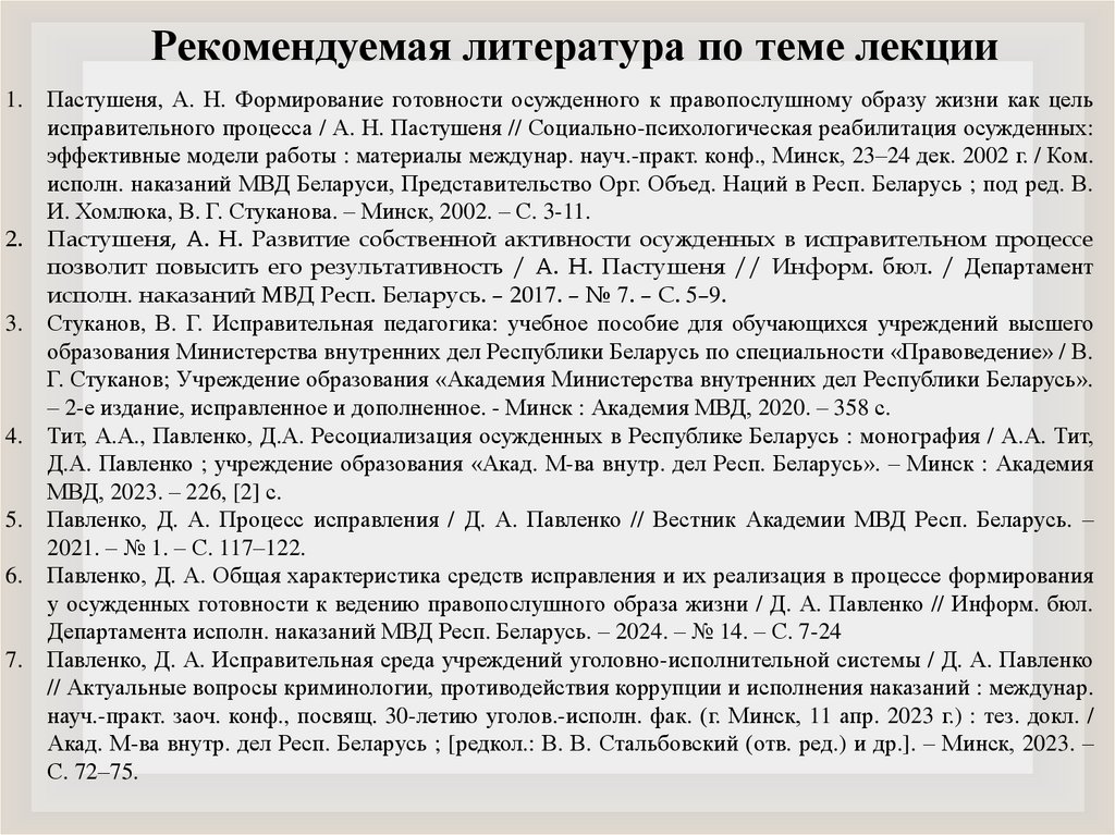 Пастушеня, А. Н. Формирование готовности осужденного к правопослушному образу жизни как цель
