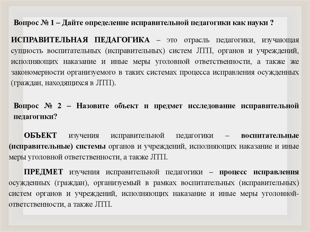 Вопрос № 2 – Назовите объект и предмет исследование исправительной