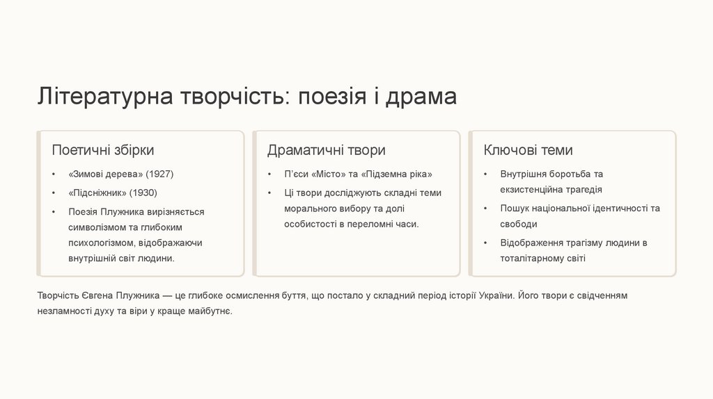 Творчість Євгена Плужника — це глибоке осмислення буття, що постало у складний період історії України. Його твори є свідченням