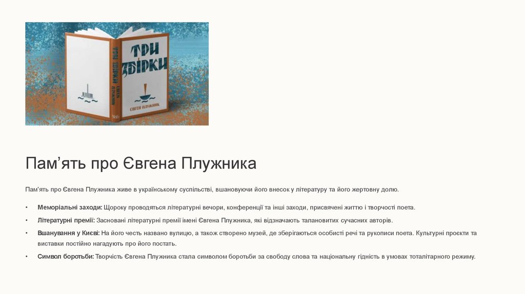 Пам’ять про Євгена ПлужникаПам'ять про Євгена Плужника живе в українському суспільстві, вшановуючи його внесок у літературу та його жертовну долю.