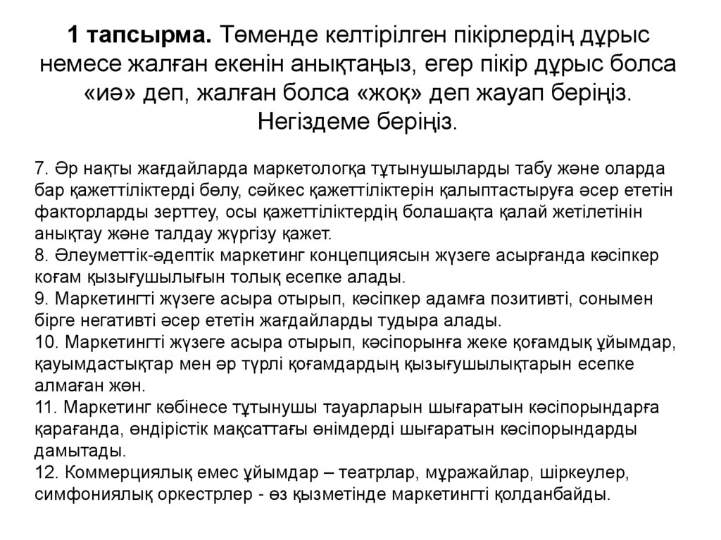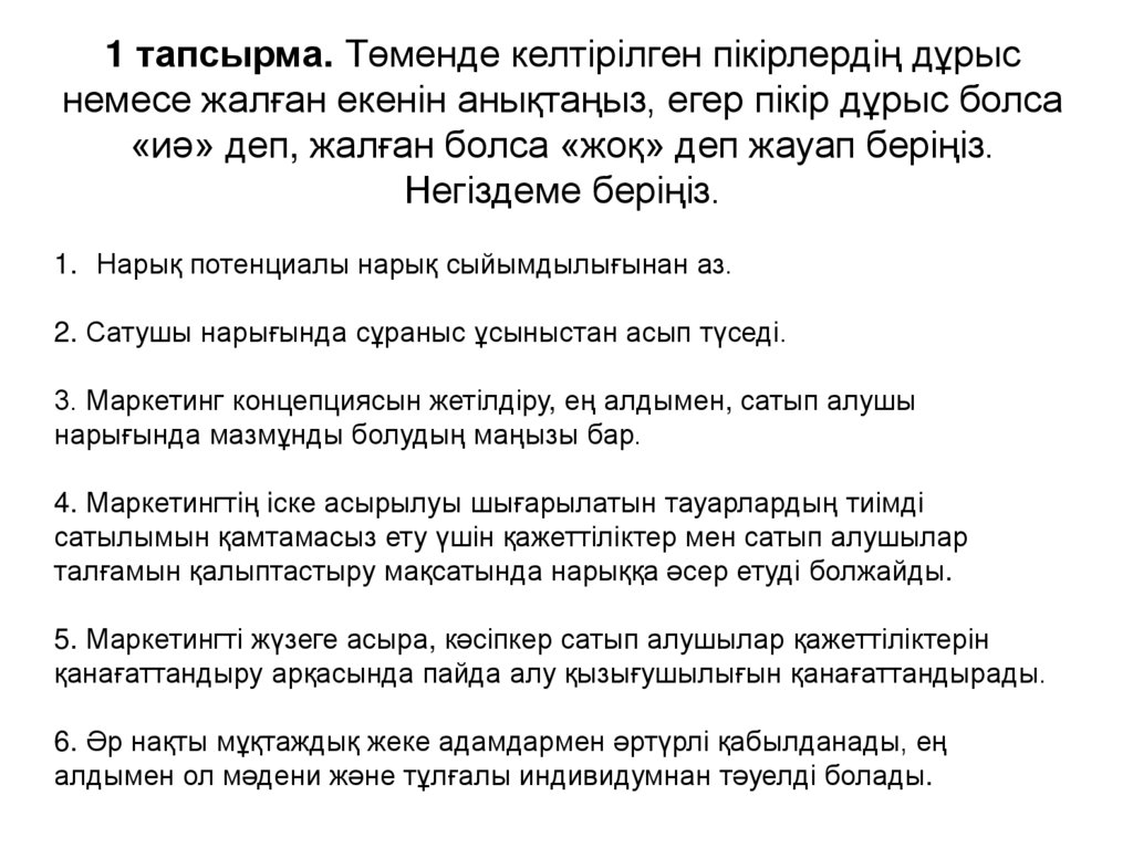 1 тапсырма. Төменде келтірілген пікірлердің дұрыснемесе жалған екенін анықтаңыз, егер пікір дұрыс болса