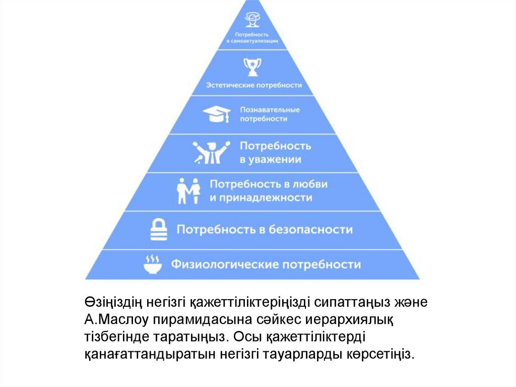 Өзіңіздің негізгі қажеттіліктеріңізді сипаттаңыз жәнеА.Маслоу пирамидасына сәйкес иерархиялық