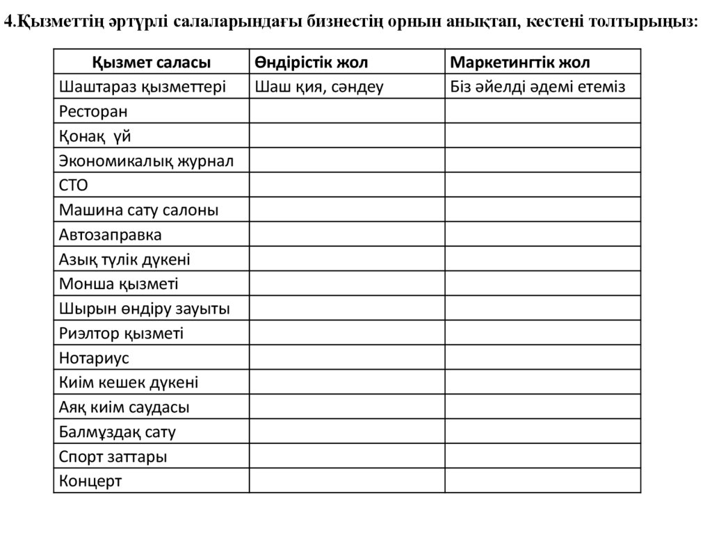 4.Қызметтің әртүрлi салаларындағы бизнестің орнын анықтап, кестені толтырыңыз:Қызмет саласы