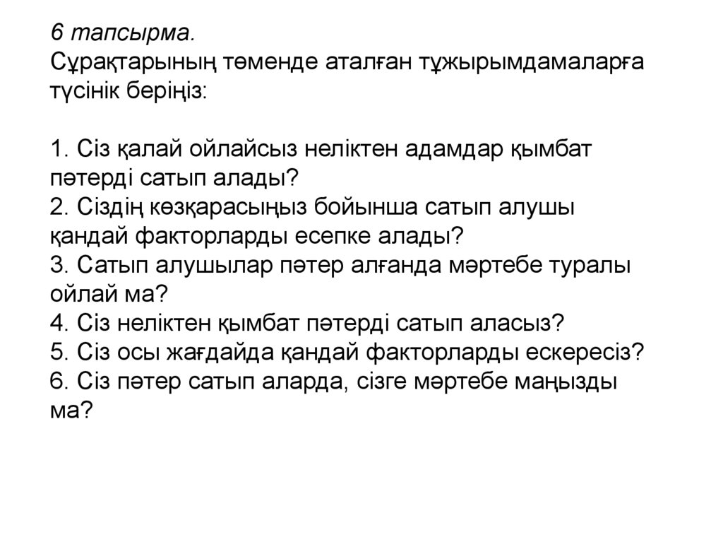 6 тапсырма.Сұрақтарының төменде аталған тұжырымдамаларға