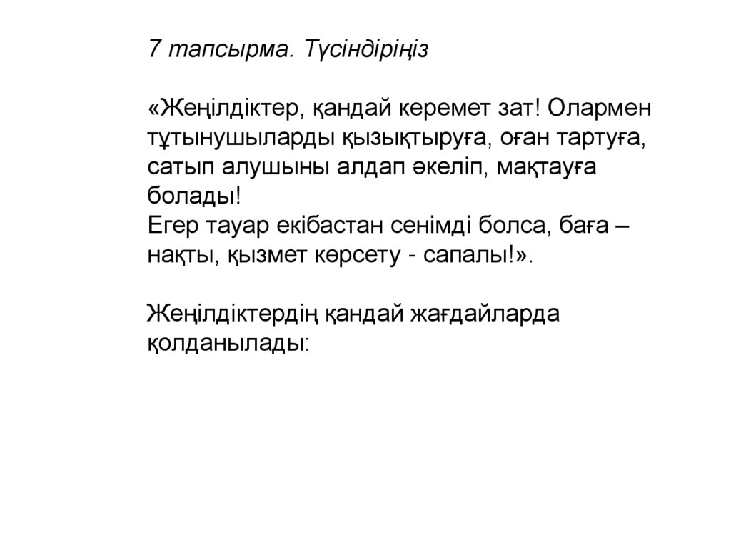 7 тапсырма. Түсіндіріңіз«Жеңілдіктер, қандай керемет зат! Олармен