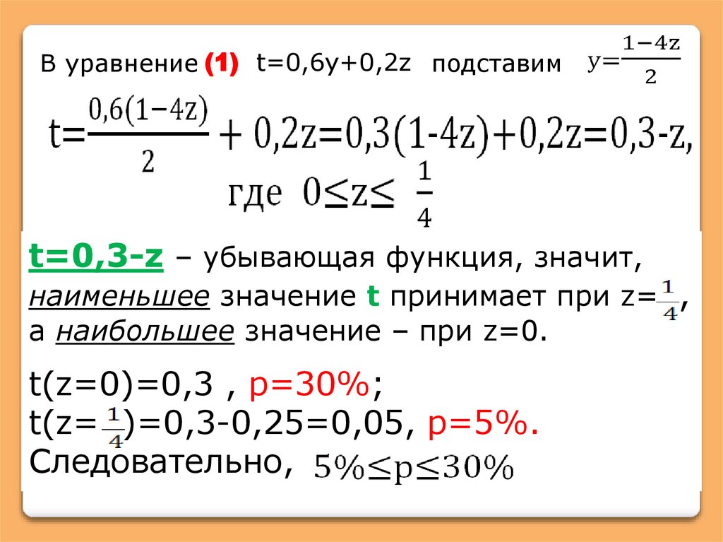 В уравнение (1) t=0,6y+0,2z подставимt=0,3-z – убывающая функция, значит,