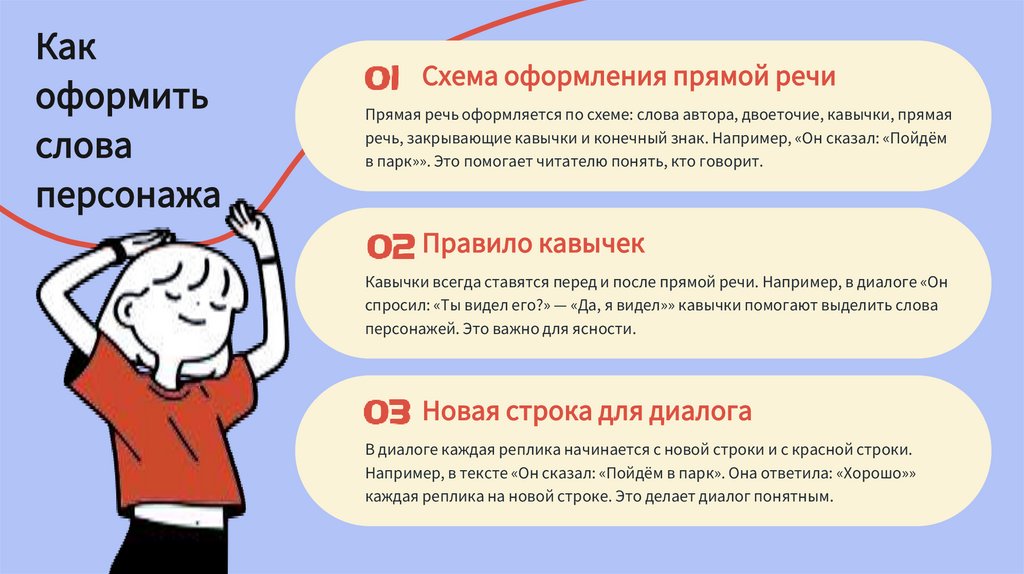 Прямая речь оформляется по схеме: слова автора, двоеточие, кавычки, прямая