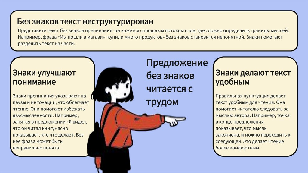 Без знаков текст неструктурированПредставьте текст без знаков препинания: он кажется сплошным потоком слов, где сложно определить границы мыслей.