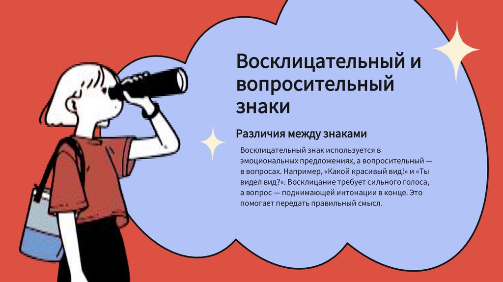в вопросах. Например, «Какой красивый вид!» и «Ты