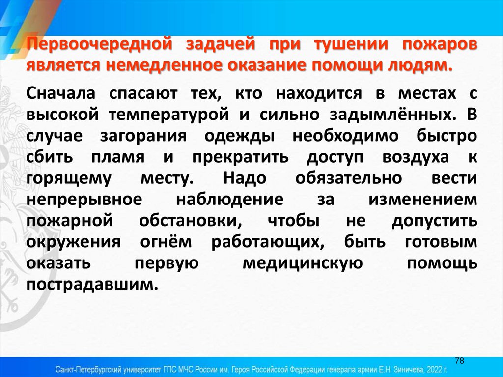 Первоочередной задачей при тушении пожаровявляется немедленное оказание помощи людям.
