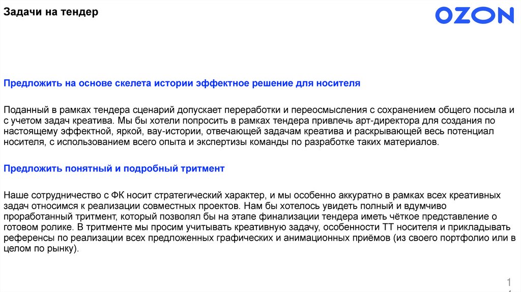 готовом ролике. В тритменте мы просим учитывать креативную задачу, особенности ТТ носителя и прикладывать