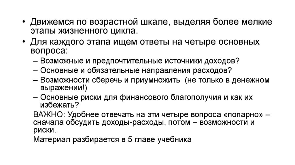 • Движемся по возрастной шкале, выделяя более мелкиеэтапы жизненного цикла.