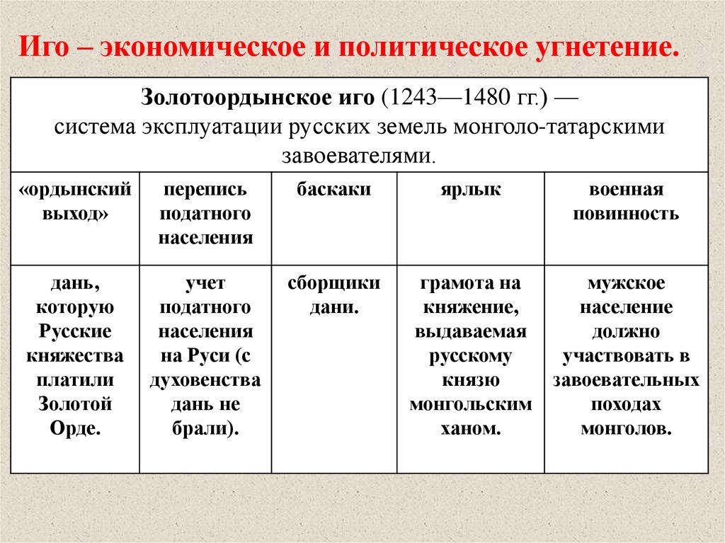 Иго – экономическое и политическое угнетение.Золотоордынское иго (1243—1480 гг.) —