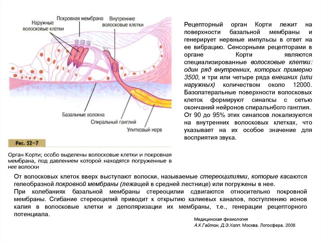 Рецепторный орган Корти лежит наповерхности базальной мембраны и