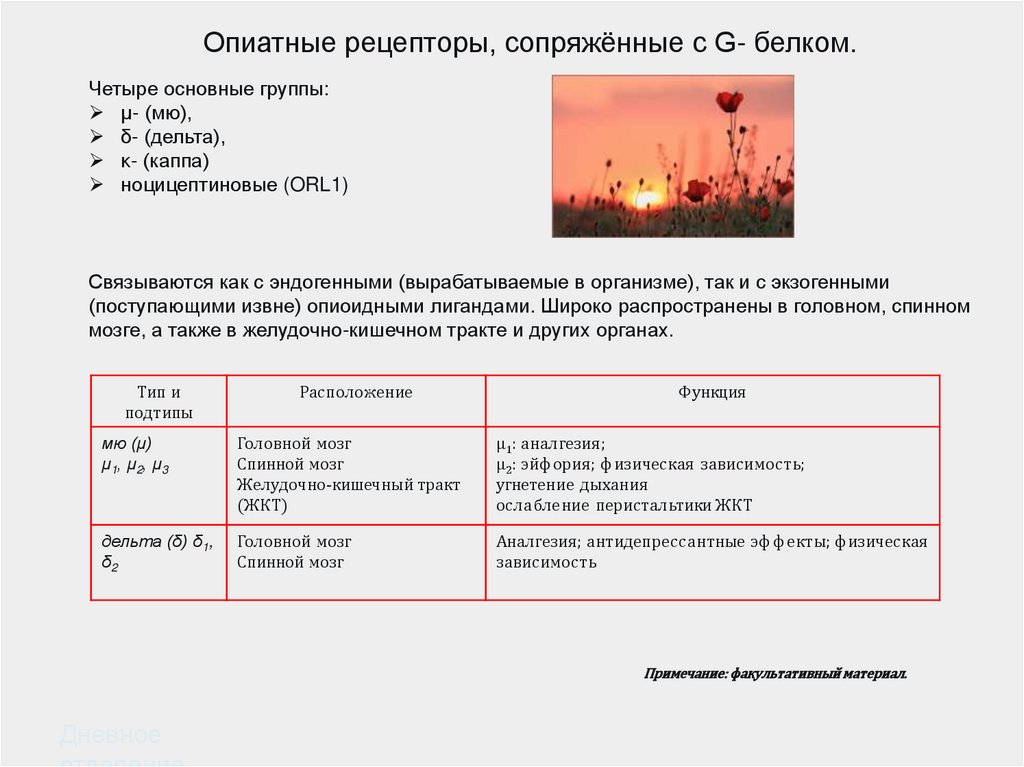 Опиатные рецепторы, сопряжённые с G- белком.Четыре основные группы: