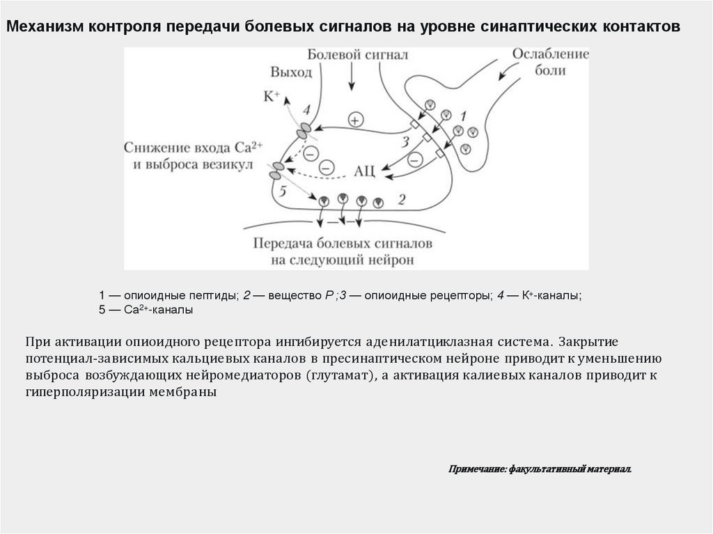 Механизм контроля передачи болевых сигналов на уровне синаптических контактов1 — опиоидные пептиды; 2 — вещество Р ;3 — опиоидные рецепторы; 4 — К+-каналы;