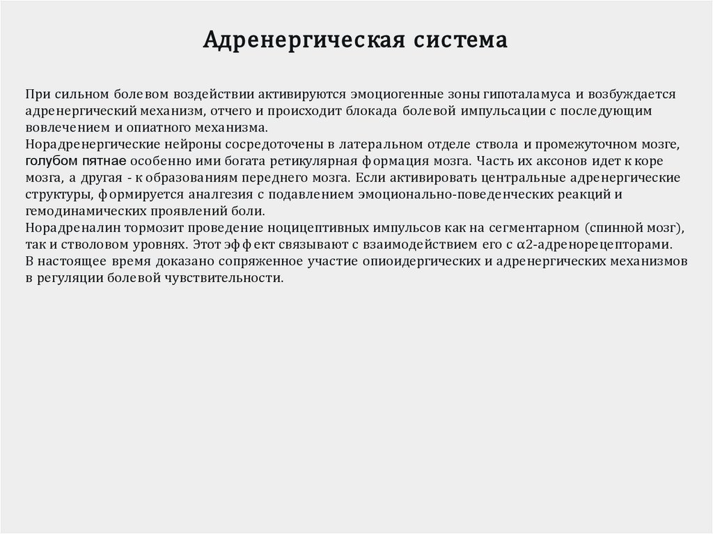 В настоящее время доказано сопряженное участие опиоидергических и адренергических механизмов