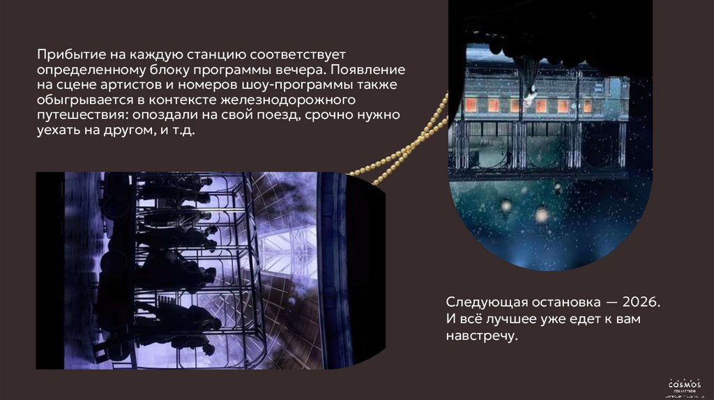 Прибытие на каждую станцию соответствуетопределенному блоку программы вечера. Появление