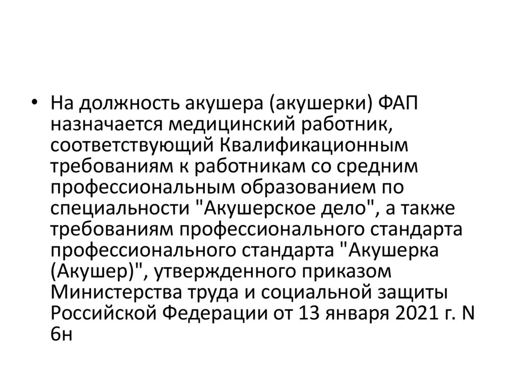 • На должность акушера (акушерки) ФАПназначается медицинский работник,