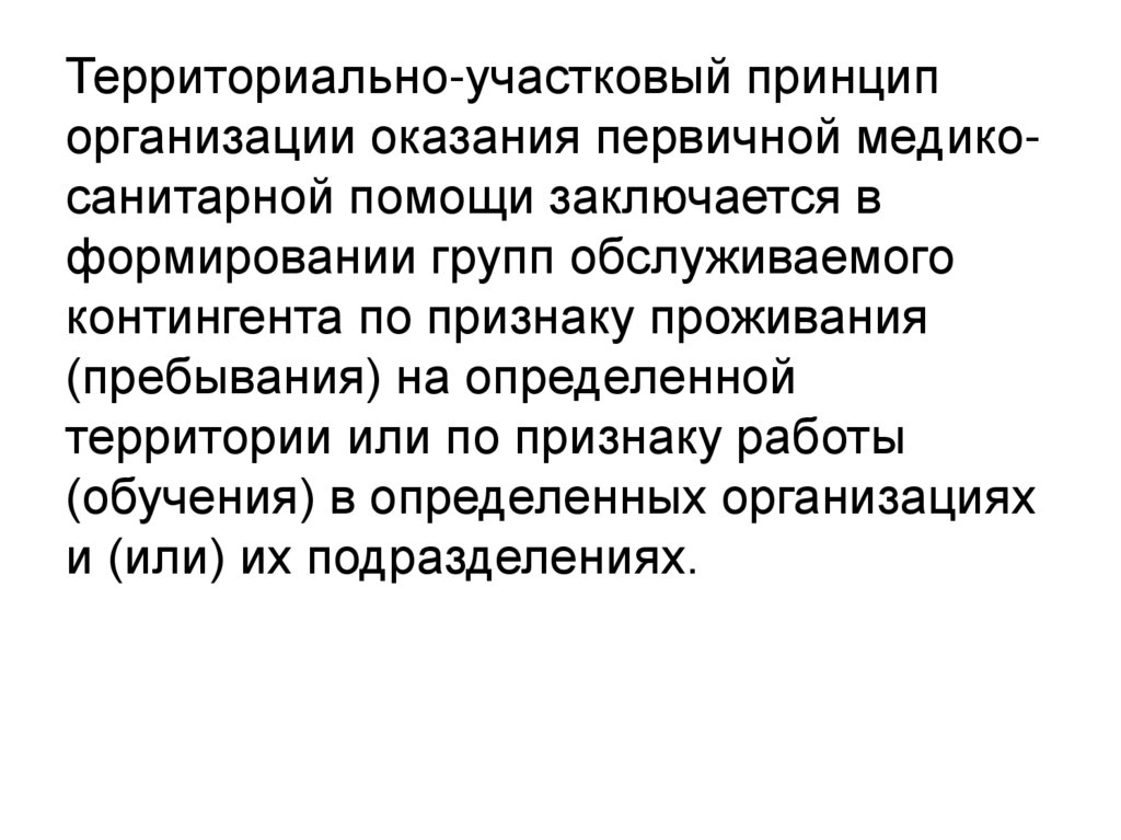 Территориально-участковый принципорганизации оказания первичной медикосанитарной помощи заключается в